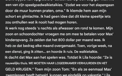 Nadat we hadden opgehangen, schreef ik een brief aan mijn oma – kort en eerlijk. Ik deed hem in een envelop en stopte hem in mijn tas naast de telefoon. Er stond: « Oma, het spijt me als wat er morgen gebeurt je pijn doet, maar je hebt me altijd geleerd dat de waarheid belangrijker is dan troost. Ik hoop dat je daar nog steeds in gelooft. »