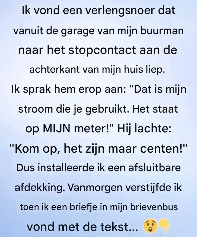 en oranje verlengsnoer lag als een neonkleurig pad over mijn gazon, rechtstreeks van de garage van mijn buurman naar mijn stopcontact in de achtermuur van het huis. Ik bleef even staan, niet wetend wat ik ervan moest denken. Misschien was het maar tijdelijk, redeneerde ik. Misschien hadden ze het erin gestoken en waren ze het vergeten. Maar toen ik het snoer beter volgde, werd het duidelijk dat de verbinding opzettelijk was gemaakt – zonder het mij te vragen. Even was ik verbaasd in plaats van geïrriteerd – we hadden het altijd goed met elkaar kunnen vinden.