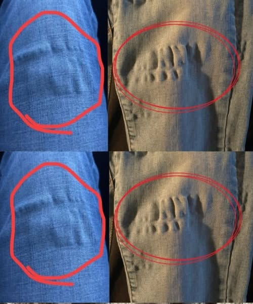 Goedkope jeans of jeans die minder zorgvuldig zijn gemaakt, zijn mogelijk gevoeliger voor dit probleem. Maar zelfs dure jeans kunnen plooien krijgen als ze van stretchdenim zijn gemaakt of ongelijke naden hebben.