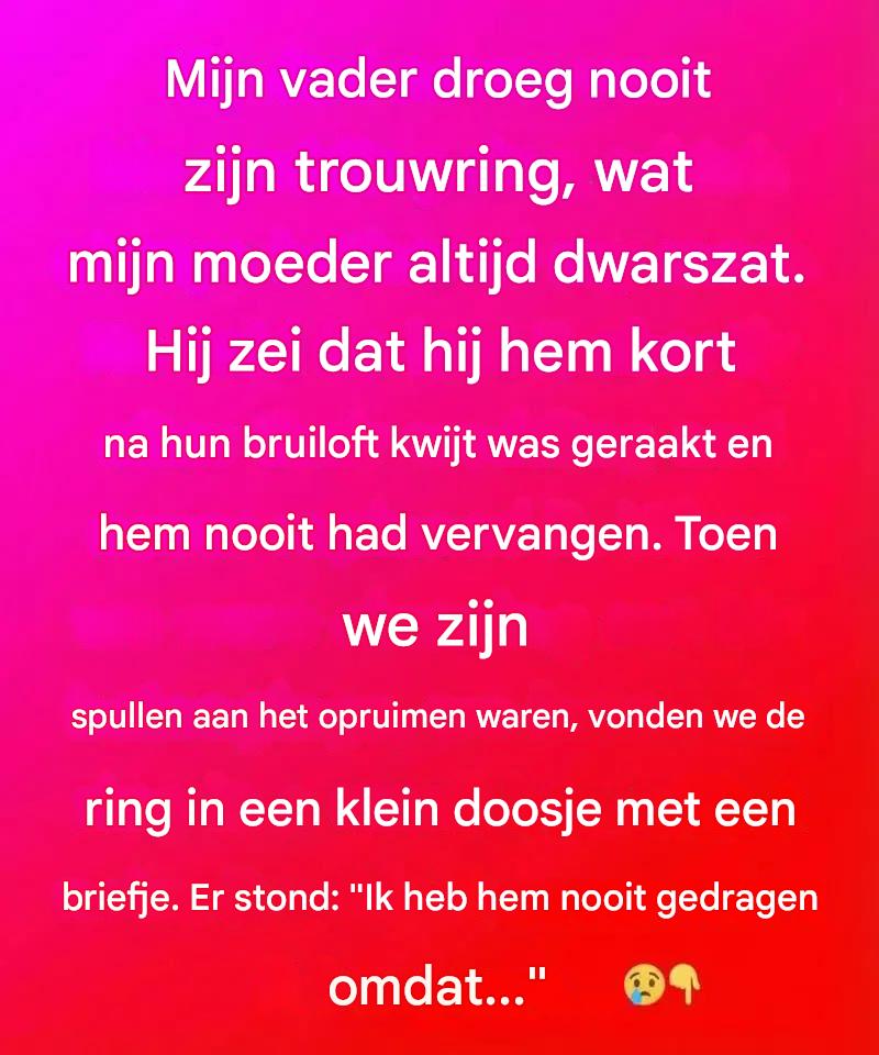 Toen we na het overlijden van mijn vader zijn spullen gingen uitzoeken, verwachtten we niet meer dan de gebruikelijke snuisterijen – oude jassen, versleten gereedschap, verbleekte bonnetjes. In plaats daarvan vonden we een klein doosje dat ons beeld van hem volledig veranderde. Daarin lag zijn trouwring, zorgvuldig verpakt in een zachte doek, samen met een handgeschreven briefje dat begon met: ‘Ik droeg hem niet omdat…’