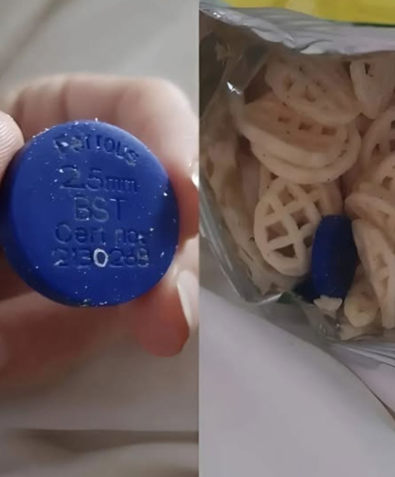 Mijn zoon had net een verzegelde zak met zure room chips geopend toen er iets vreemds uitviel, samen met de chips—een klein, stevig blauw schijfje dat daar duidelijk niet thuishoorde. Onmiddellijk raasden mijn gedachten door elke mogelijke zorg. Ik zei dat hij meteen moest stoppen met eten en keek beter naar het voorwerp. Niet zeker wat het was of hoe het in de tas terecht was gekomen, maakte ik een foto en plaatste die online, in de hoop dat iemand het mysterie kon oplossen.