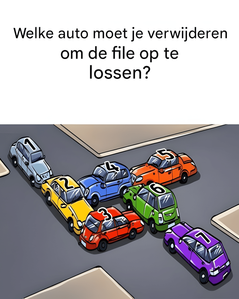 Op de foto (stel je voor dat je dit ziet) veroorzaken 7 auto’s een ware chaos. Het is aan jou om de oplossing voor het probleem te vinden: je hoeft maar één auto te verplaatsen, en alles wordt duidelijk.