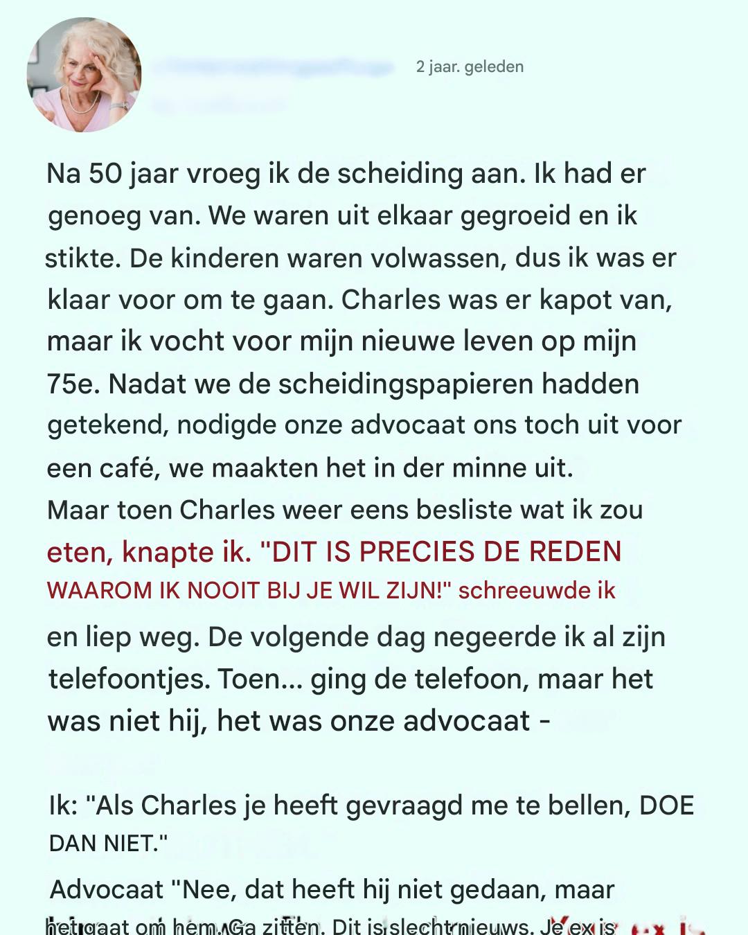 Een oudere vrouw vraagt na vijf decennia huwelijk haastig de scheiding aan van haar man. Na een tijdje krijgt ze een brief waarin iets staat wat ze al 50 jaar niet heeft gehoord.