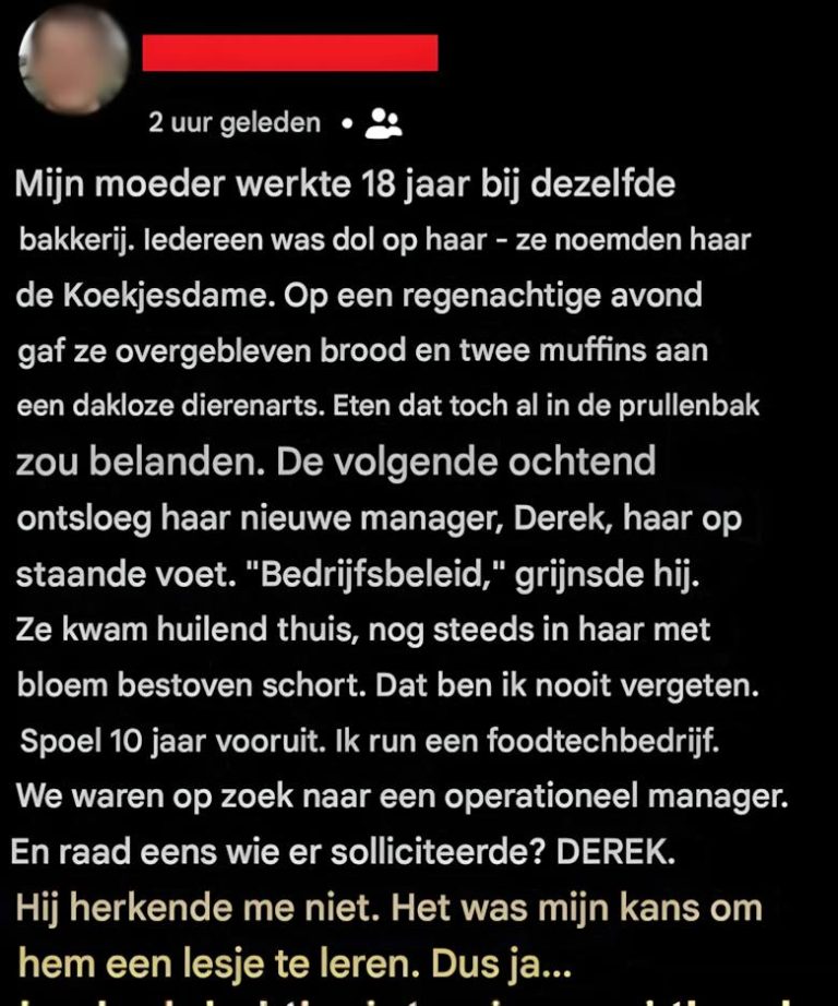 De volgende ochtend werd ze in plaats van lof gestraft. De nieuwe manager, Derek, riep haar naar zijn kantoor en deelde haar koeltjes mee dat ze werd ontslagen wegens ‘het overtreden van het bedrijfsbeleid’. Geen waarschuwing, geen begrip, alleen een wrede beslissing die haar hart verbrijzelde.